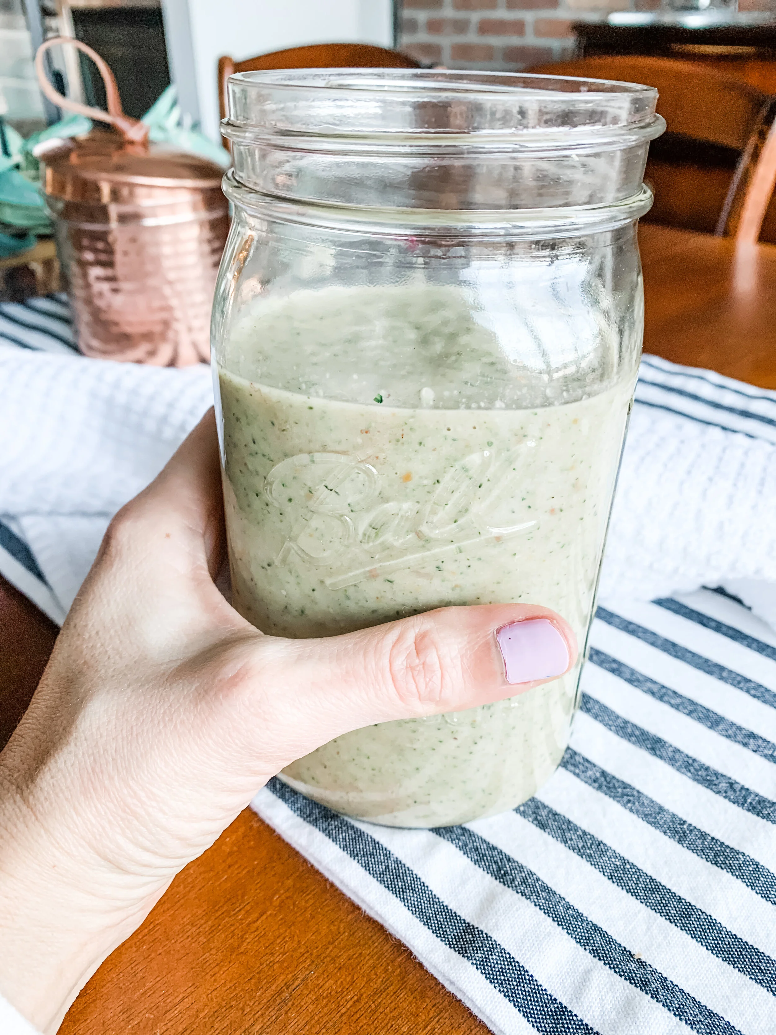 I blend everything in a wide-mouth quart-sized Mason jar using my hand immersion blender. Make sure to blend it super well so the broccoli is barely detectable. I screw on the lid, carry it to work and drink it when I’m ready.