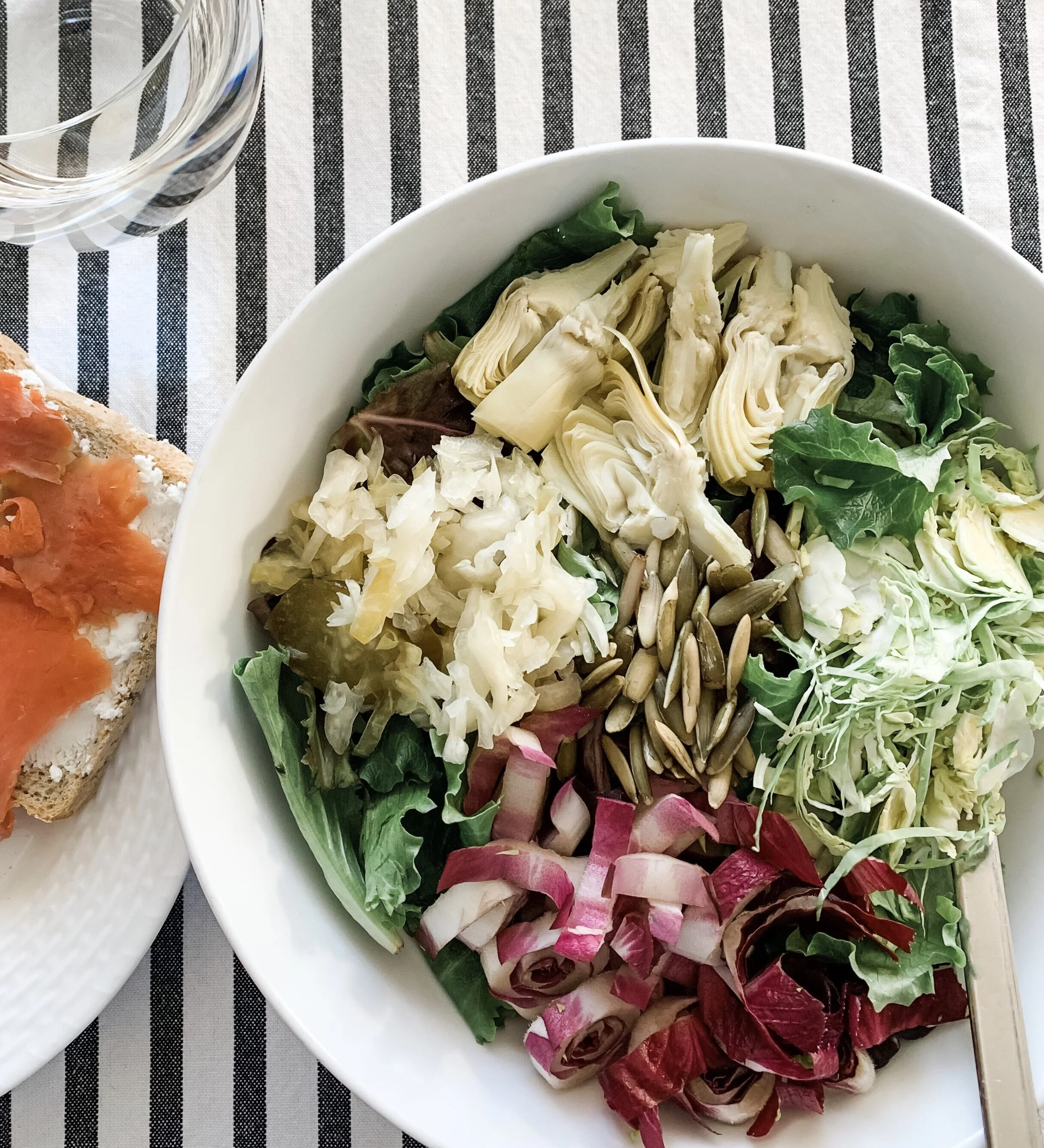 The easiest way to eat a variety of veggies is with a salad. I create a base of arugula, watercress or a variety of baby greens and then top it with chopped beets, shaved brussel sprouts, artichoke hearts, sauerkraut, avocado and sunflower or pumpkin seeds. The sauerkraut is a good substitute for dressing.
