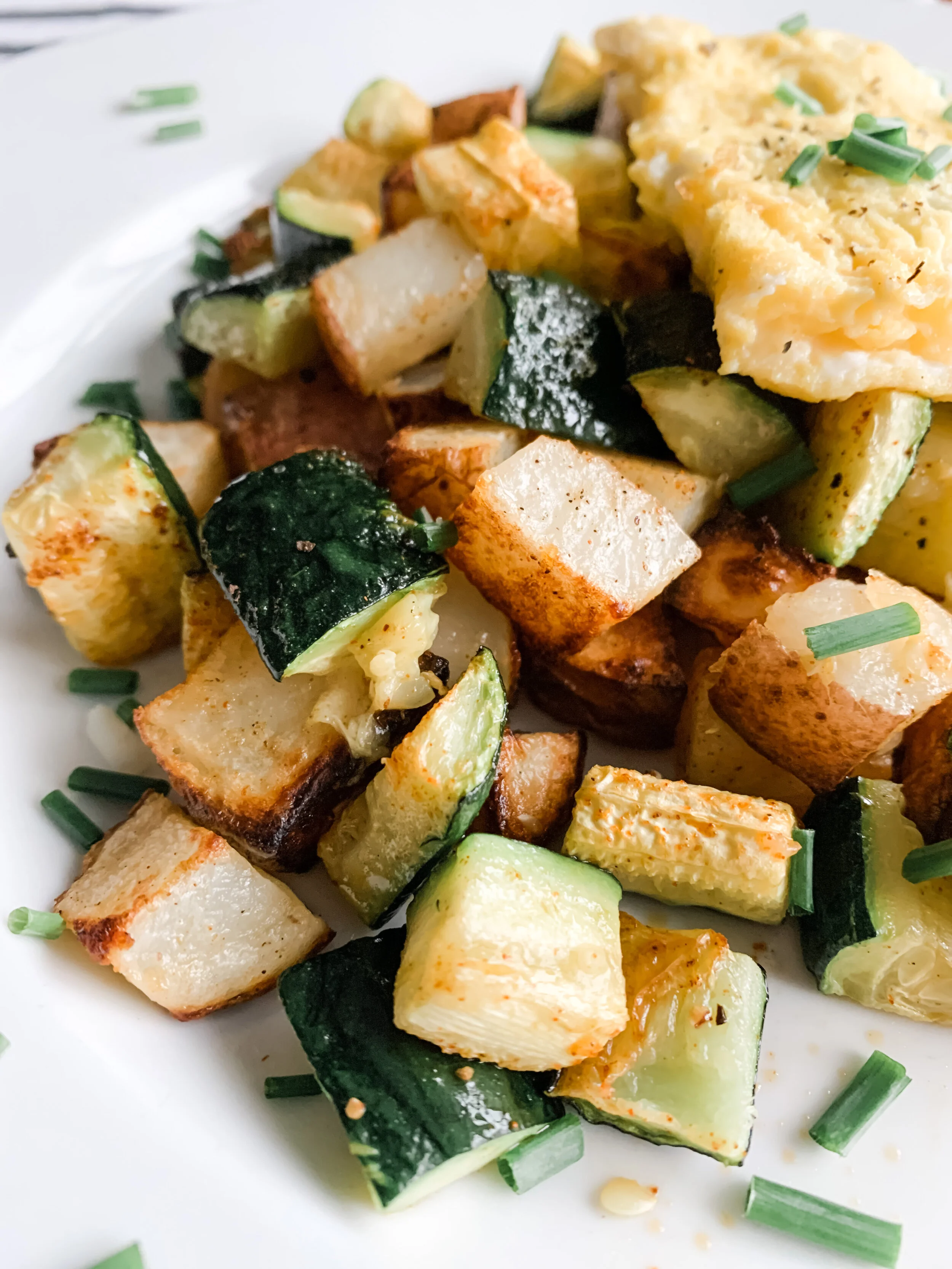 With more time in the morning on the weekends, I can cook. So I scramble up a few eggs and eat them with a quick veggie hash. You can use leftover roasted veggies from the night before or do a quick veggie broil. I line a sheet pan with zucchini and potato pieces cut into half-inch squares, toss them in a bit of grapeseed oil, and then set them under the broiler, flipping them once. They cook surprisingly fast because they’re so small. Just watch them closely or they will burn. Rotate between sweet potatoes and white, yellow and red potatoes to get more variety.