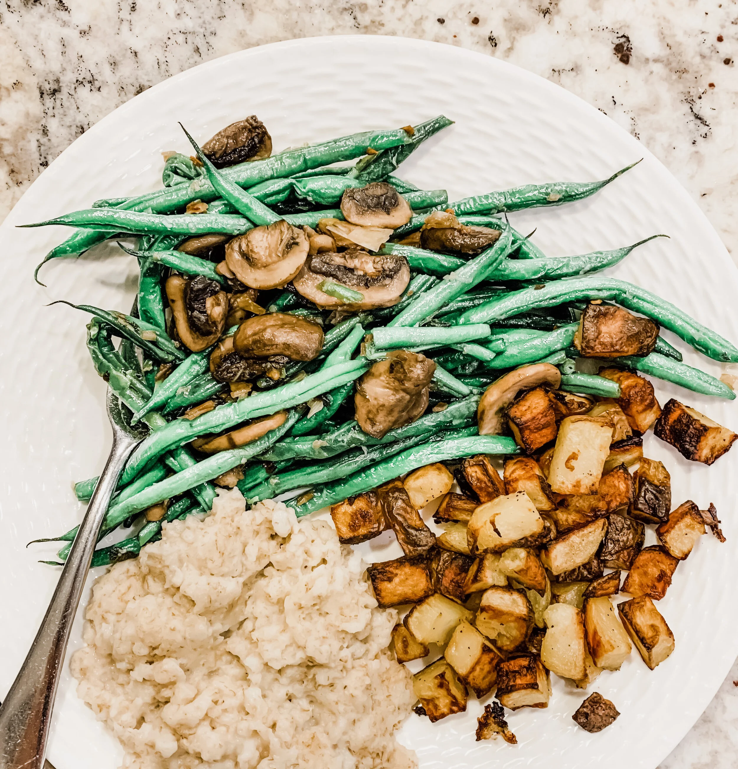 My dinners are vegetarian 95% of the time. Quick cooked veggies is how I roll. And I rarely use a recipe. Most nights, I make a mix of veggies roasted on a sheet pan or sauteed in a cast iron skillet. This night the green bean casserole inspired me. I sauteed green beans in a little ghee with mushrooms, leeks, garlic, and fresh sage with a bit of beef bone broth. Dinner time is my chance to use healing aromatics and spices like fresh garlic, leeks and sage.