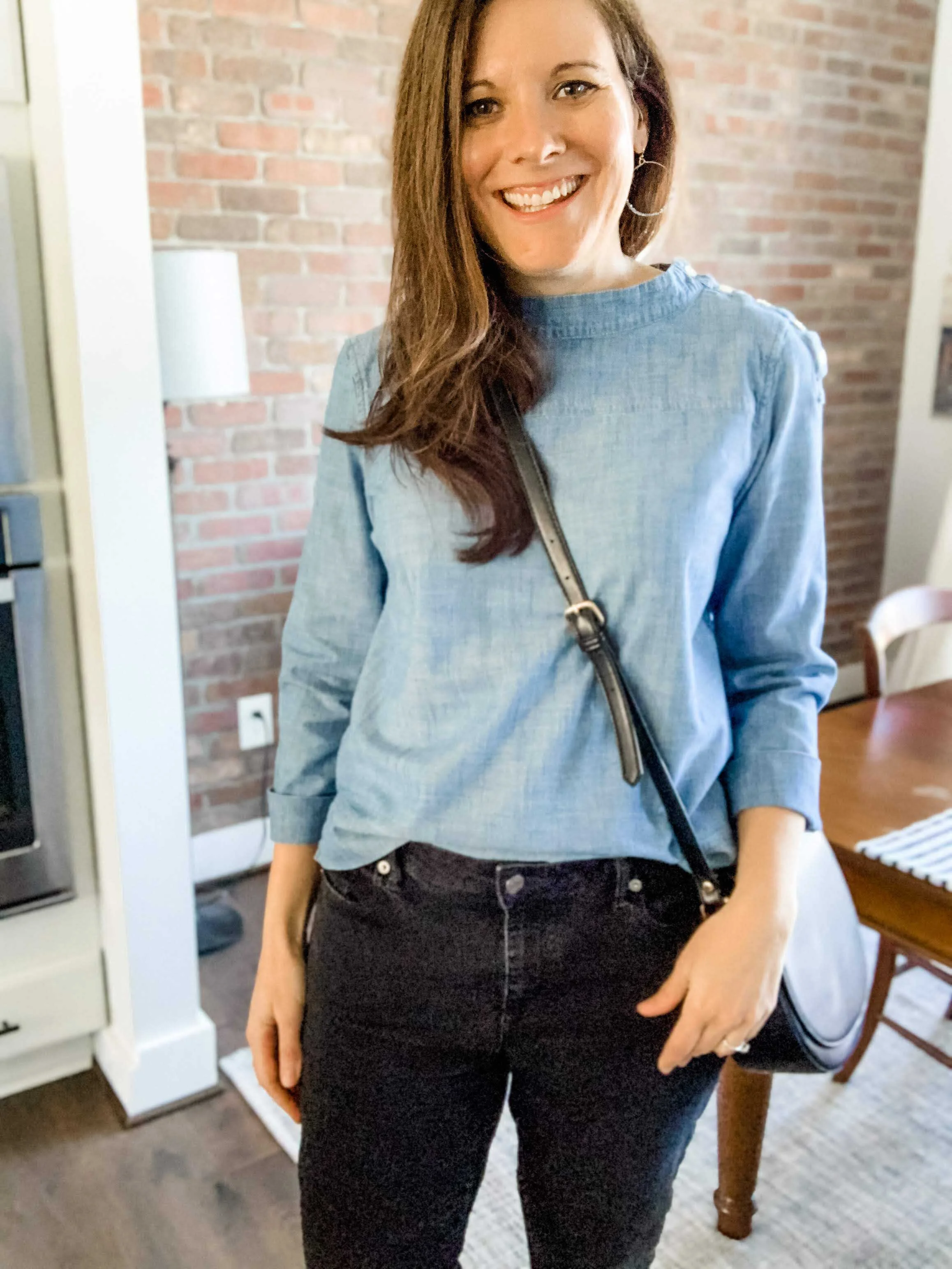 Here’s the blouse again with chambray stripes. I pair it with grey skinny jeans, cognac colored flats and purse.